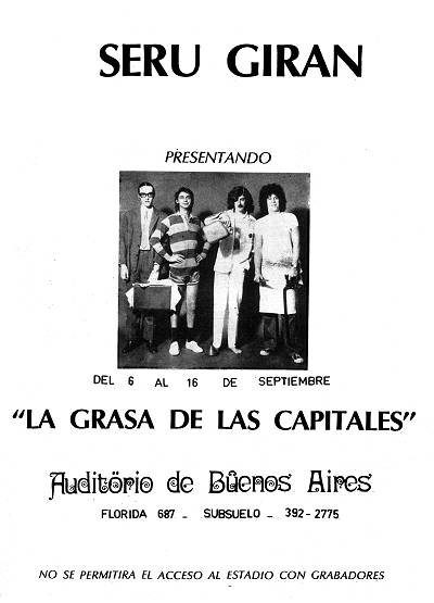 La grasa de las capitales es el segundo álbum de estudio de la banda argentina de rock serú girán, editado en agosto del año 1979 por sazam y presentado en el auditorio buenos aires (ex kraft), desde el 6 al 16 de septiembre de 1979. Открыть страницу «seru giran» на facebook. In 1978, serú girán was released after recording sessions in são paulo and los angeles, u.s., having daniel goldberg … read more. La grasa de las capitales lyrics. After its deeply criticized debut album serú girán, the band went in search for a different sound, one that could be closer to the fans' expectations.